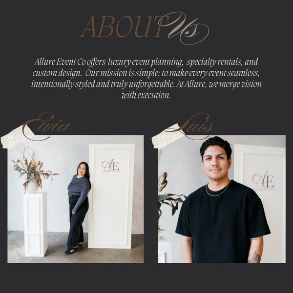 I’m Elvia, your lead event planner and designer, and this is Luis, our in-house fabricator and operations manager. Together, we combine creativity and precision to bring you clean, modern, and elevated events—from the concept to the last detail.
